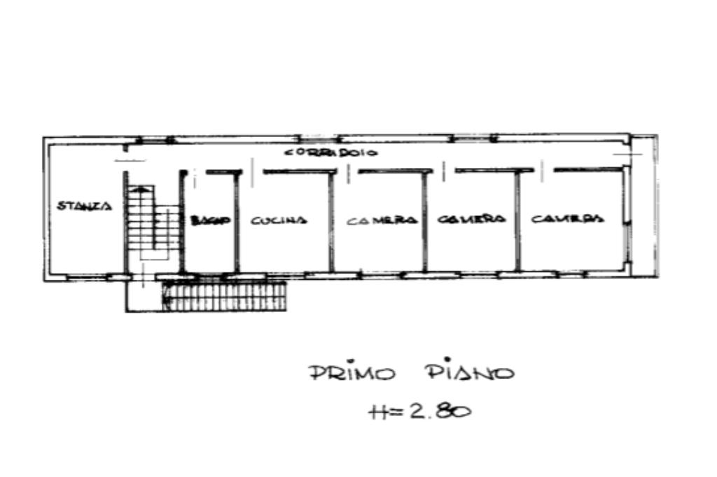 Al primo piano si trova la parte residenziale, composta da un ingresso luminoso che conduce al soggiorno; a seguire troviamo la cucina e un bagno. Una porta separa la zona giorno dalla zona notte, quest’ultima composta da tre camere da letto e, al termine del corridoio, un terrazzo.